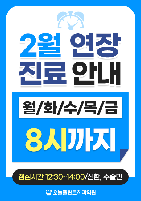 설 연휴 이후 환자분들의 예약 요청이 많아 쾌적한 진료환경을 위해 연장진료 진행합니다. 2/19~2/27 평일 8시까지 연장 진료하오니 내원 시 참고 부탁드립니다. |
